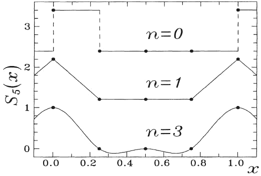 | Fig. 1. Periodaj (P=1) bazaj splajnoj S1(x) por L=4 egaldistancaj laŭ argumento "karakterizaj punktoj" kaj difekto k=1 por diversaj n. |