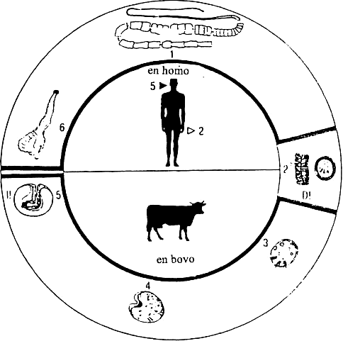 Bildo 1 Tenio saginata (Taenia saginata): Plenkreska cestodo (1) vivas en la maldika intesto de homo. La eligita matura proglotido (2) enhavas ovojn, kiuj estas infektaj por bovoj. La onkosfero (3) liberiĝas en la bova intesto, enpenetras la mezenterajn sangovazojn kaj pluevoluas (4) en la muskolaro al infektokapabla cisticerko (5), kiu malfaldiĝas (6) en la homa intesto kaj pluevoluas al adolto (1). (D! = diagnostika pruvo; I! = infekta stadio) |