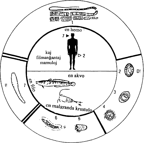 Bildo 2. Difilobotrio lata (Diphyllobotrium latum): La plenkreska cestodo (1) eligas ovojn (2) en kiuj evoluas koracido (3) kun cilia randaĵo (4). En ĝi troviĝas onkosfero (5), kiu pluevoluas en la "unua intera gastiganto" al procerkoido (6). Post ingesto per "dua intera gastiganto" la procerkoido disvolviĝas al plerocerkoido (7), kiu estas la infekta stadio por la "fina gastiganto" (homo kaj aliaj vertebruloj). |