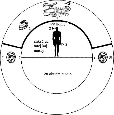 | Bildo 3 Himenolepido nana (Hymenolepis nana): Plenkreska cestodo vivas en homa intesto. Per fekaĵo eligita ovo (2) estas senpere infekta por la homo mem pro enhavanta onkosfero (2), kiu pluevoluas en la intestokanalo histo al cisticerkoido (3) kaj disvolviĝas al adolto (1). |