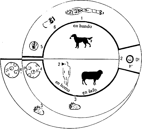 Bildo 4. Eĥinokoko granuloza (Echinococcus granulosus): Plenkreska vermo (1) en la maldika intesto de hundo produktas ovojn (2) per kiuj infektiĝas la intera gastiganto (muso, ŝafo, bovo, homo). La eloviĝinta onkosfero (3) disvolviĝas al hidatido (4). En ĝi evoluas proskoleksoj (5) kiuj malfaldiĝas (6) kaj kreskas al adolto (1). |