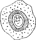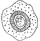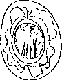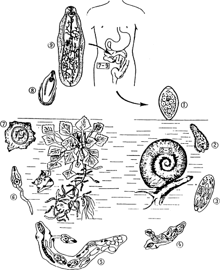 | Bildo 8. Fasciolopso buska (Fasciolopsis buski): Nematura ovo (1) en kiu poste evoluas miracidio (2), per kiu infektiĝas limako. En tiu "unua intera gastiganto" disvolviĝas sporocistoj kun redioj (3) kiuj transformiĝas al patrinaj redioj kaj produktas idajn rediojn (4), el kiuj estiĝas cerkarioj (5). La cerkario (6) adheriĝas al akvoplanto (kiu servas kiel "dua intera gastiganto") kaj pluevoluas al encistigita metacerkario (7). Post ingesto, juna distomo liberiĝas el la metacerkaria ŝelo (8) kaj pludisvolviĝas en la intestokanalo al adolto (9). |