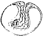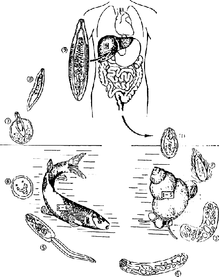| Bildo 9 Opistorĥido fela (Opisthorchis felineus): En la ovo (1) troviĝas miracidio (2) kiu liberiĝas en la "unua intera gastiganto" kaj evoluas al sporocisto (3) kaj redio (4), kiu produktas cerkariojn (5). La longvosta cerkario estas infekta por "dua intera gastiganto", en kiu ĝi disvolviĝas al metacerkario (5), kiu estas infekta por la "fina gastiganto". Post engluto liberiĝas juna distomo (8) el la metacerkaria ŝelo (7) kaj kreskas en la fingastiganta hepato ĝis adolta stadio (9). |