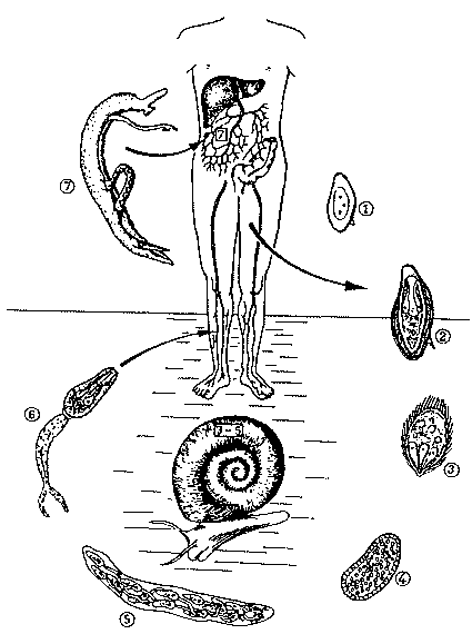 | Bildo 7 Sĥistosomo mansona (Schistosoma mansoni) La freŝe demetita parazita ovo (1) en la fingastiganta vejno devas penetri tra la sangovazan vandon por atingi la intestan internon (lumenon). Per fekaĵo eligita ovo kun miracido (2) liberiĝas en la intera gastiganto (3) kaj transformiĝas al juna patrina sporocisto kun ĝermoĉeloj (4) el kiuj disvolviĝas idaj sporocistoj kun cerkarioj (5). La forkovosta cerkario (6) estas senpere infekta por la homo kaj traboras ties haŭton kaj kreskas al adolta stadio en la mezenteraj sangovazoj. |