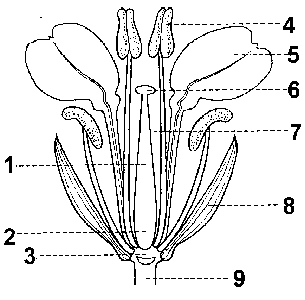 La stamenon oni povas ankoraŭ dispartigi en la partojn filamento kaj antero. Dum la pistilo videble konsistas el la partoj ovario, stiluso kaj stigmo.